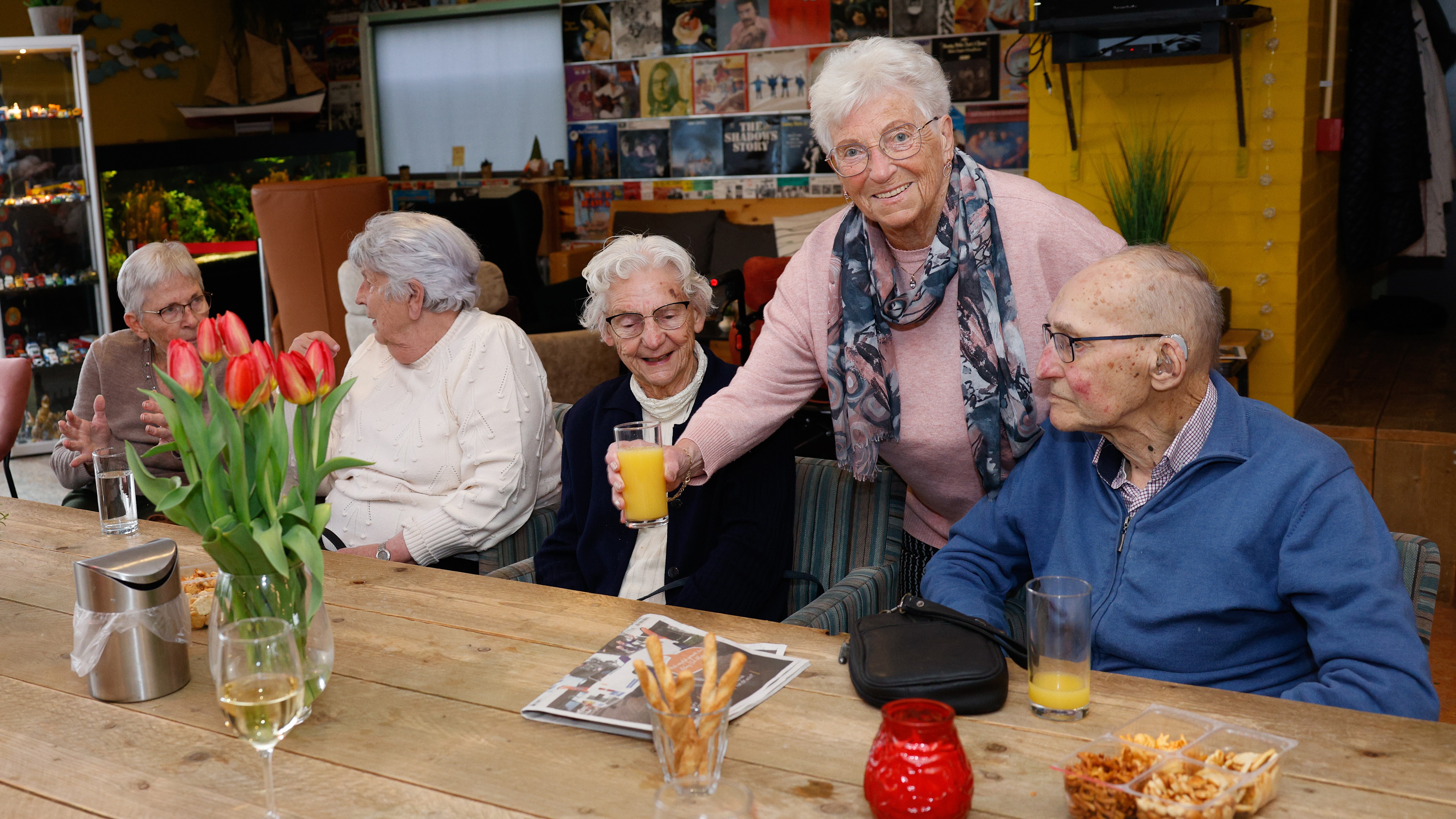 Truus vindt het heerlijk om daar te zijn. “Ik ben blij dat ik dit nog kan doen. En ik eet natuurlijk zelf ook mee”, zegt ze vrolijk. Haar man Jan overleed zeven jaar geleden. Ze begrijpt goed waarom ouderen graag komen. “Het is toch fijn om een avondje weg te zijn?” De meeste bezoekers zijn vrouwen, met een paar mannen erbij. Ze worden opgehaald met de buurtmobiel. “We begonnen met 8 mensen, nu zijn het er 30. Ze blijven terugkomen omdat het zo gezellig is!”